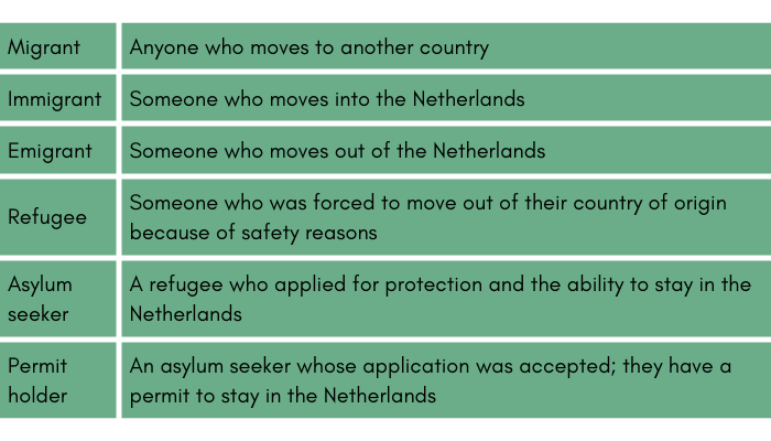 When talking about immigrants, most refer to people who moved voluntarily. However, ‘migrant' is an umbrella term for people who move to another country, regardless of the reason. Migrants typically move for work, education, or family reasons. However, in 2024, 14,5% of the migrants coming to the Netherlands were refugees.